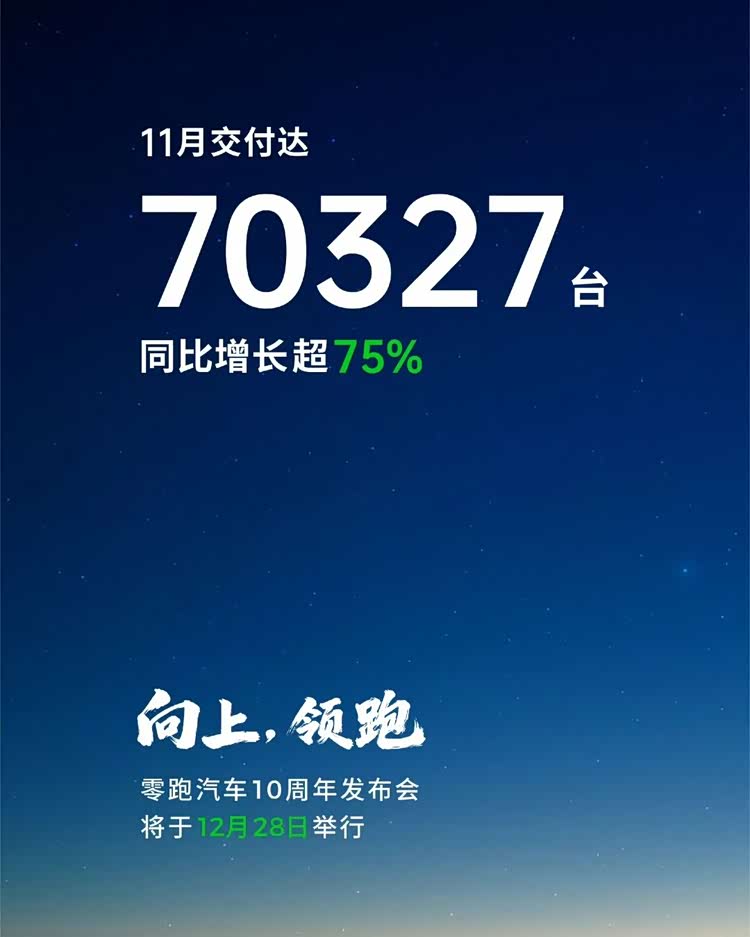 2025年零跑汽车前11个月销量为53.61万辆,同比增长113.4%;11月中旬宣布年内销量突破50万辆,提前45天完成全年任务。