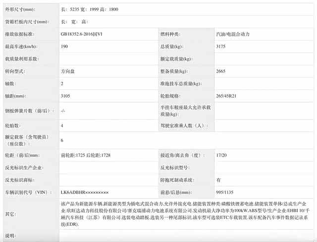 星光L定位插电式混合动力车型,纯电续航超过150公里,动力电池采用的是瑞浦赛克动力和国轩高科。星光L车身尺寸为(单位mm)长:4980 宽:1930 高:1760,轴距2950mm,有五六座可选。前轮距:1630 后轮距:1645。