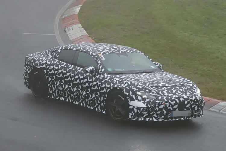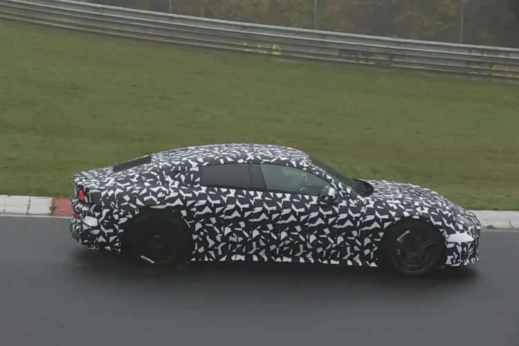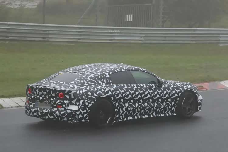 在阴雨连绵的纽堡北环上,一辆纯电AMG GT 4门轿跑车正在极限状态下进行测试。这辆原型车目前仍被十分严密地伪装着,不过我们可以看到在它前轮中的青铜色刹车卡钳,以及在发动机盖上不明用途的通风口。
