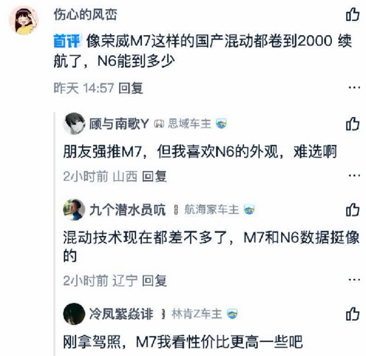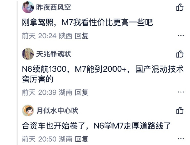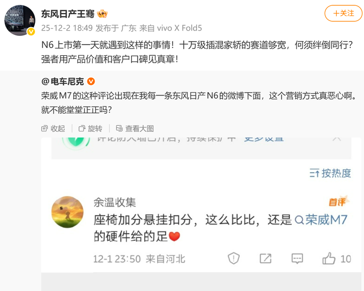 这一现象直接引发了东风日产法务部的关注,后者不仅公开了疑似荣威M7 DMH水军的评论截图,还发文谴责“多个网络自媒体账号在微博等社交平台,恶意发布针对日产N6的不实信息,借日产N6上市热度为某品牌车型引流”。