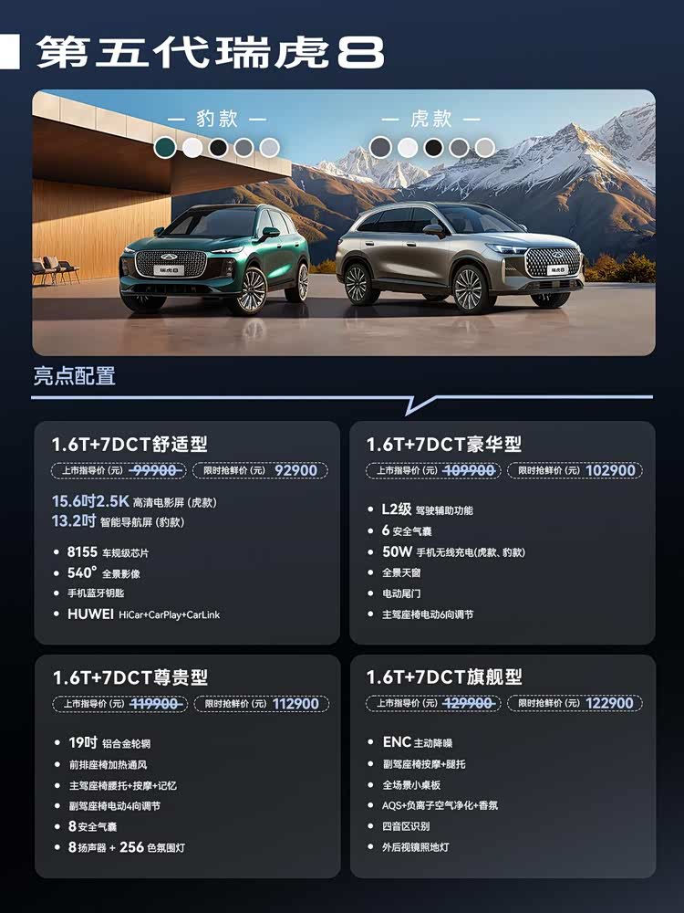 瑞虎8(参数|询价)是奇瑞的支柱车型,因此奇瑞毫不吝啬地将好技术、好设计、好资源都倾注于它。那么第五代瑞虎8的表现到底怎么样?