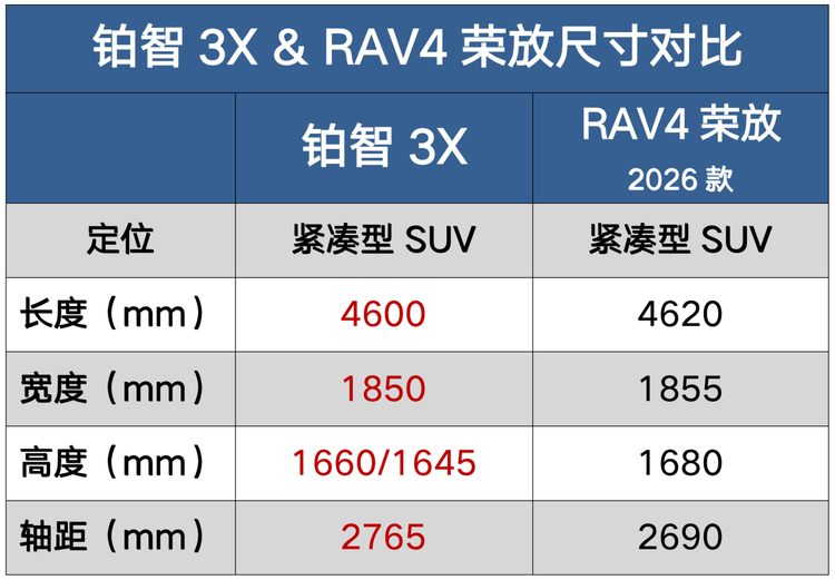 从尺寸上来看,铂智3X的轴距是2765mm,车长4600mm,车宽1850mm,车高1660/1645mm,算是比较标准的紧凑型SUV的身材了,单纯地罗列参数你可能觉得比较抽象,所以,我把铂智3X和丰田自家的RAV4荣放做了一个尺寸对比,你大概就能够想象到它的个头儿有多大了,铂智3X的长宽高与RAV4荣放相差不大,但是2765mm的轴距比RAV4荣放更长;在车侧的设计上,铂智3X的车顶与车窗下沿几乎是平行的设计,能够让整个车身显得更修长敦实。