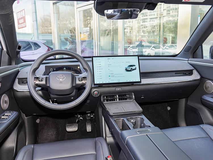 内饰的设计比较简洁,横平竖直的造型是时下流行的风格,不过车内几乎没有实体按键,中控区域只保留了“双闪”和“紧急下电”两个按钮,甚至它的多功能方向盘两侧也只保留了滚轮儿和两个按键,说实话,丰田在这方面有点儿“学坏”了,我个人一直非常讨厌这种取消物理按键的做法;车机屏幕全系都是14.6英寸,内置高通骁龙8155芯片,支持语音识别控制、车联网、OTA升级等等,在智能化方面,终于跟得上国产新能源车的节奏了。