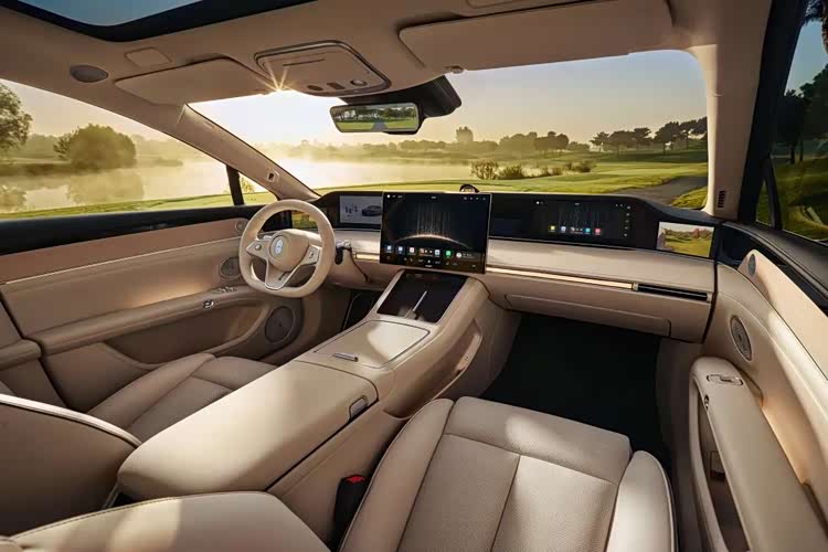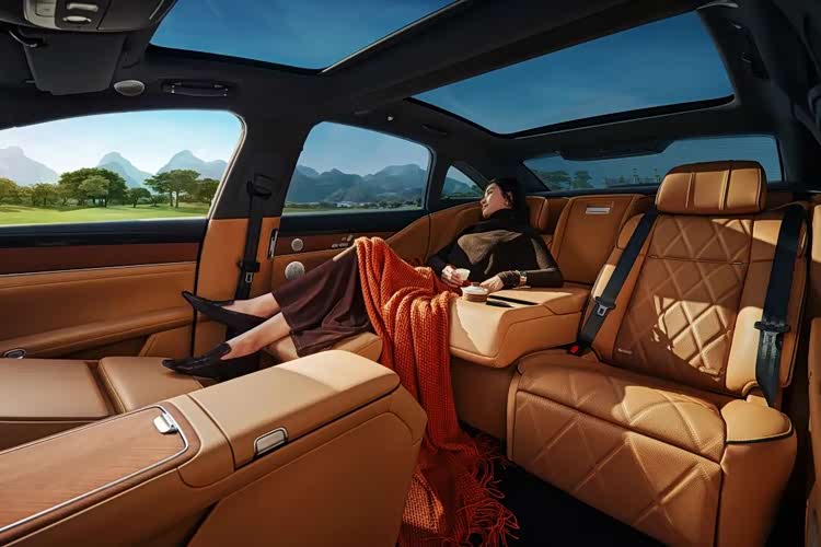 内饰是两车舒适性比拼的核心战场。岚图追光L秉承“山海同光”理念,营造出简洁而高级的东方禅意座舱。T字形中控布局简约大气,配备16.1英寸3K HDR悬浮中控屏与10.25英寸仪表屏,辅以256色氛围灯及智能美妆镜。座椅是其一大亮点:豪华云朵座椅采用10层人体工学结构+35mm快慢回弹海绵,全系标配前后排加热、通风与10点SPA按摩功能;主驾支持14向电动调节与记忆、腿托延伸,副驾则为真零重力座椅,可一键实现超宽角度舒躺。此外,该车还配备1.21㎡双段全景天幕、四温区空调、6.6L宽温域智能冷暖冰箱以及VOYAH Sound 7.1.4全景声音响系统,共同打造出静谧奢华的移动私享空间。