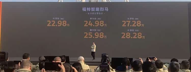需要说明的是,这台车的全称叫做 福特智趣烈马(参数|询价),新车提供三款增程、两款纯电车型可以选择。其中增程版搭载1.5T的增程器并匹配单挡变速箱,另外可以提供CLTC 220km的纯电续航,电池容量为43.7度的磷酸铁锂;而纯电版车型则搭载105.4度的磷酸铁锂电池,可以提供CLTC 650km的纯电续航,其售价区间为22.98万~28.28万元。
