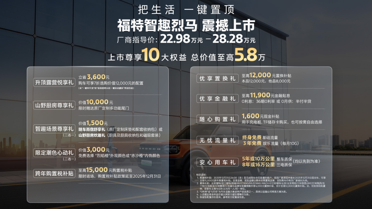 除了福特越野系列DNA加持下的个性外观,智趣烈马还能提供可升降车顶,一二排座椅一键成床等独特配置,甚至车尾门还能支持各种拓展,加上移动冷暖箱,直接变身移动的家。如果你对这台车有兴趣,听我告诉你怎么选!