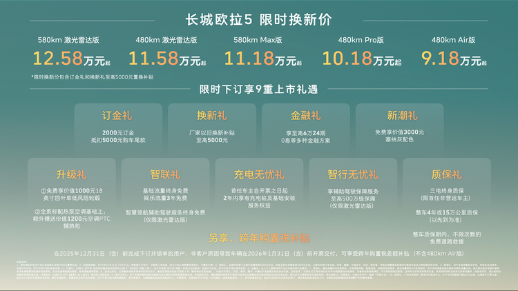 为了让这份“全球严选”触手可及,长城欧拉5推出了极具诚意的上市政策:新车建议零售价区间为9.98万至13.38万元。更为惊喜的是,即日起至2025年12月31日,用户下订并锁单,即可尊享限时换新价9.18万元起(含至高5000元以旧换新补贴)。此外,购车还可享受包含订金礼、新潮礼、智行无忧礼在内的9重上市好礼。针对全系车型(480km Air版除外),在2025年12月31日(含)前完成下订并锁单的用户,非客户原因导致车辆在2026年1月31日(含)前开票交付,更可享跨年购置税补贴 。
