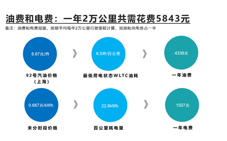 众所周知,插电混动车型既能享受国家新能源车购置税减免优惠,减轻用户的购车压力,也能兼顾动力性能与燃油经济性,帮助用户节约用车开支。尤其是对于平时上下班通勤需求较多且具备家用充电桩条件的用户来说,插电混动车型的用车成本并不算高。考虑到用户的用车需求不同,加油和充电习惯也不一样,在油费和电费计算方面必然存在一定差异。我们以2026款蓝山智能进阶版四驱Max为例,假设该车型每年行驶里程为20000公里,其中加油和充电各占一半。油费方面,该车型可以加注92号汽油,目前上海地区92号汽油价格为6.67元/升,该车型一年下来油费开支约4336元。