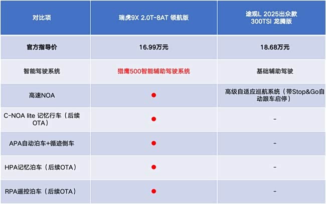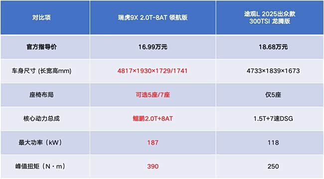 通过对比不难看出,途观L以其深厚的品牌积淀和均衡表现,依然是一位合格的“稳健之选”。但瑞虎9X,则以“全能颠覆者”的姿态,在核心的空间实用性、动力性能和智能科技三个维度上,均展现出显著优势。
