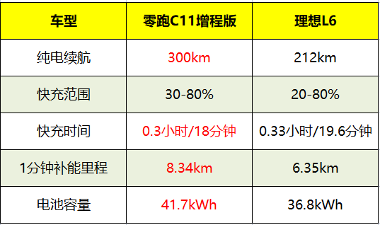 理想L6 Pro提供36.8kWh的电池包,纯电续航里程212KM,20-80%快充时间为0.33小时/19.6分钟。我也帮大家算了一下补能时间,理想L6一分钟补能6.35KM,零跑C11一分钟补能8.34KM,很显然,零跑C11的纯电里程和补能效率,要更适合城区代步,可以更轻松的实现0油耗出行。