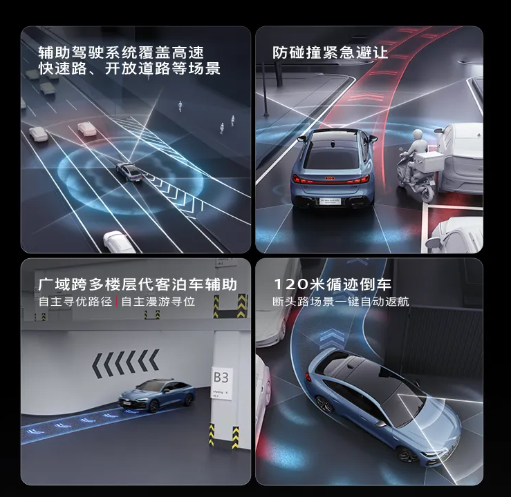 进入车内,中控区域采用悬浮环抱式布局,表面处理以雾面磨砂质感为主。仪表盘和中控屏由一块11.9英寸液晶仪表与14.5英寸触控屏共同构成的曲面联屏组成,副驾驶前方则单独设置了一块10.9英寸娱乐屏。在驾驶辅助系统上,部分高配车型搭载了基于华为乾崑平台的智能驾驶解决方案,硬件上整合了激光雷达、高清摄像头、毫米波雷达及超声波传感器等多种感知元件。该系统能够实现高速公路与部分城区的领航辅助功能,涵盖自动汇入匝道、交通信号识别、智能泊车及遥控泊车等操作。为支撑相关功能运行,车辆针对不同动力版本配备了容量各异的独立电池组。