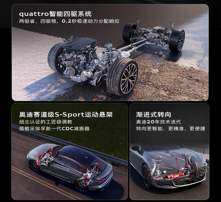 从整体设计来看,这款车型延续了奥迪品牌近年来的家族化语言,车身侧面保留了自初代车型便具备的溜背轮廓,视觉上呈现出一定的运动姿态。其车身长宽高分别为4903mm、1883mm和1427mm,轴距达到2922mm。车漆颜色方面,提供了包括飓风灰、极影黑在内的六种可选方案。