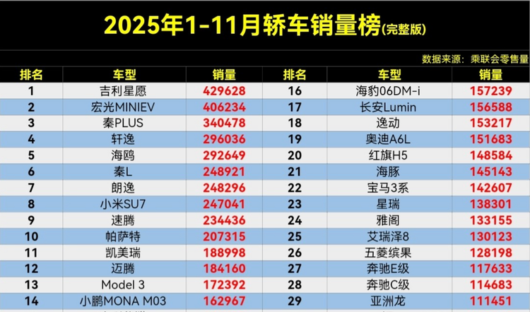 当车市的“价格战”打得像一场没有尽头的“薅羊毛”狂欢,消费者的钱包却捂得越来越紧。各大品牌使尽浑身解数,或明降或暗补,无非是想在越发谨慎的购车人心中多占一分权重。这时,一份来自乘联会的2025年1-11月轿车零售销量榜单,就像一份冷静的“体检报告”,毫不留情地揭开了市场最真实的肌理与裂痕。