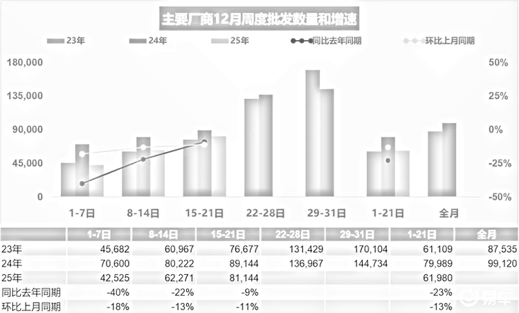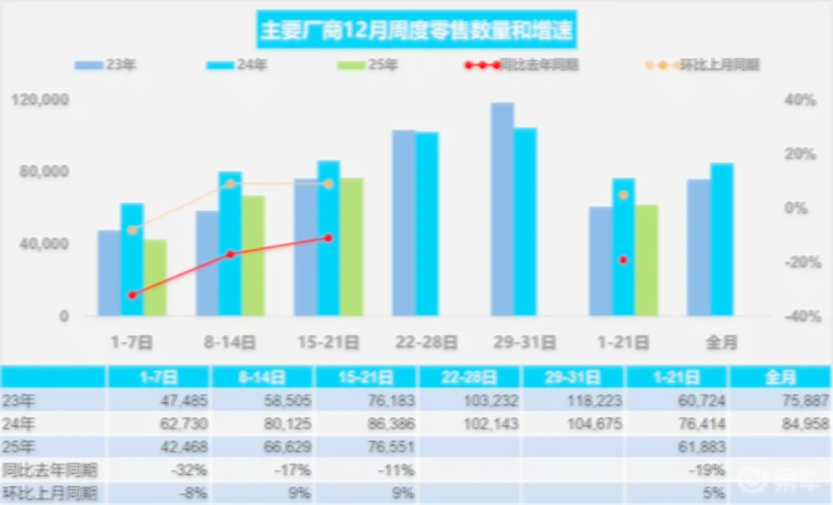 观察周度数据的变化节奏,能够看到市场波动的具体轨迹,12月第一周,市场日均零售量为4.2万辆,同比降幅为32%,环比上月同期也下降了8%。进入第二周,日均零售量回升至6.7万辆,同比降幅收窄至17%,环比转为增长9%。到了第三周,日均零售量进一步提升到7.7万辆,同比降幅继续缩小至11%,环比保持了9%的增长。综合前三周,零售总量与同比变动情况如前所述,环比上月同期增长了5%。