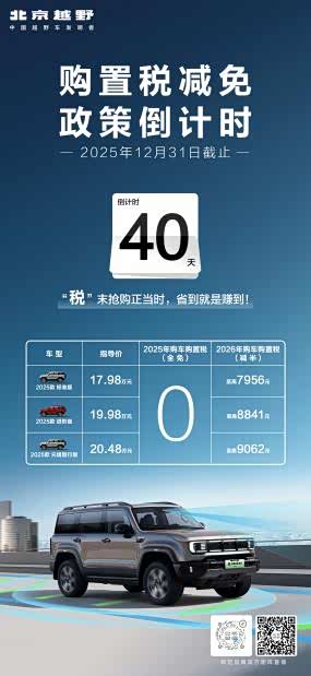 凭借硬核实力,BJ40增程元境智行上市24小时订单达到5217台。BJ40增程更是连续三个月登顶新能源越野销冠,成为当之无愧的中国硬派增程SUV领导者,更是年末上绿牌必选项。当前,购置税免征已进入倒计时阶段,今年购买BJ40增程购置税为0元;若是错过今年的窗口期,2026年则要缴纳至高9062元的购置税。想要入手BJ40增程的消费者,2025年购车就可以节省一笔数目不小的真金白银,以更低成本拥抱优质出行。