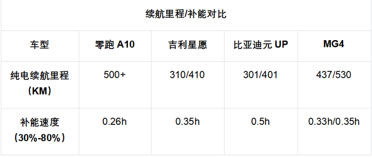 比亚迪元UP提供了301KM和401KM两个版本,满足日常城市代步通勤没有问题,但是长途出行的里程焦虑相对明显,30%-80%的快充时间需要30分钟,补能效率不高;吉利星愿的续航里程分别为410KM和510KM,长续航版本续航表现不错,但是快充时间需要25分钟左右,并且油冷电驱总成也仅在高配车型上搭载;MG4提供了437KM、530KM的续航可供选择,快充时间为25分钟左右。所以,从综合表现来看,零跑A10兼顾了长续航和快补能的双重标签。