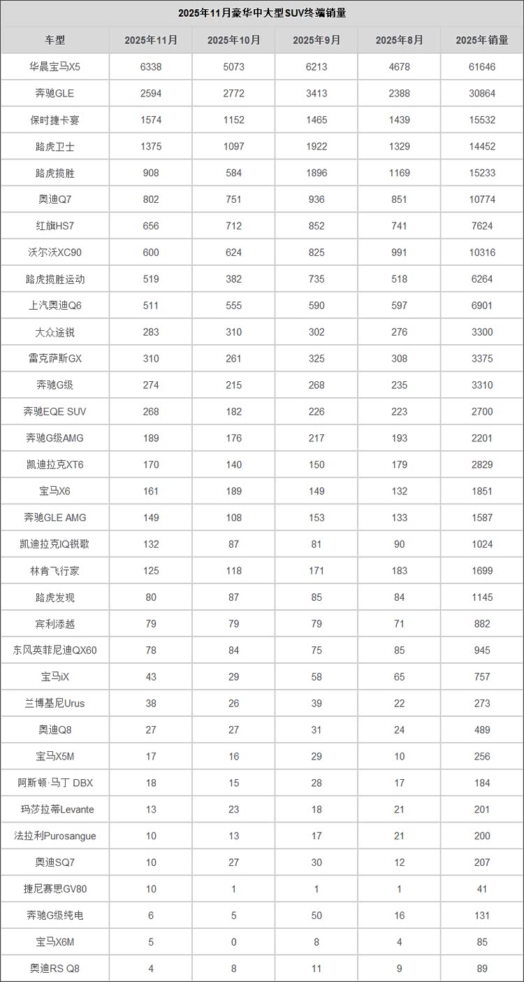 在2025年11月,华晨宝马X5依靠价格和认可度优势,守住了自己的份额,甚至还实现了销量环比增长,其月终端销量6338辆,前11个月总销量61646辆。在北京奔驰GLE上市之前,它很难在销量上被同级别车型超越。宝马X6的市场存在感不高,11月终端销量161辆,前11个月总销量1851辆,即便是偏爱运动车型的消费者,也会认为保时捷卡宴更具诱惑力。宝马iX今年前11个月总销量仅为757辆,市场存在感很低。