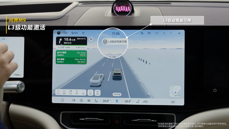设置好导航,进入政府批准的L3测试路段,屏幕上跳出提示,显示功能可用。
