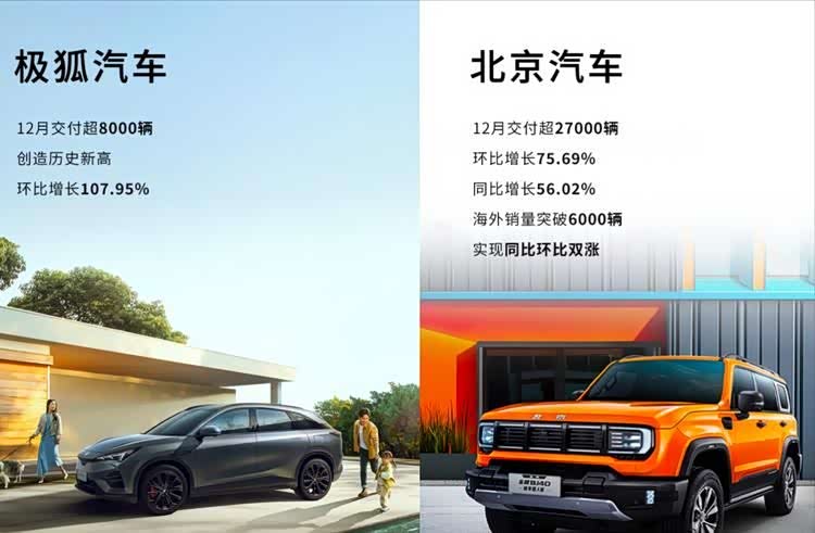 在2023年12月,北汽集团的总交付量达到了19.2万辆。其旗下包括极狐汽车、北京汽车、北京奔驰、北京现代以及北汽福田这五个品牌。在自主品牌方面,极狐汽车在当月交付了8000辆,环比猛增107.95%,创下了新的销售纪录。同时,北京汽车也交付了27000辆,同比增长56.02%,环比也上升了75.69%,且其海外销量更是突破了6000辆,实现了同环比的双重增长。