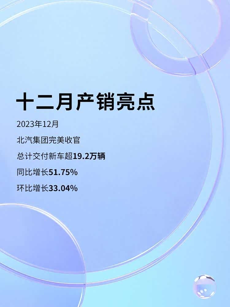 在1月10日,北汽集团发布了其旗下各品牌的最新销售业绩。据数据显示,北汽集团在2023年12月份实现了总交付量19.2万辆,与去年同期相比,增长了51.75%,而在月份环比上,也增长了33.04%。