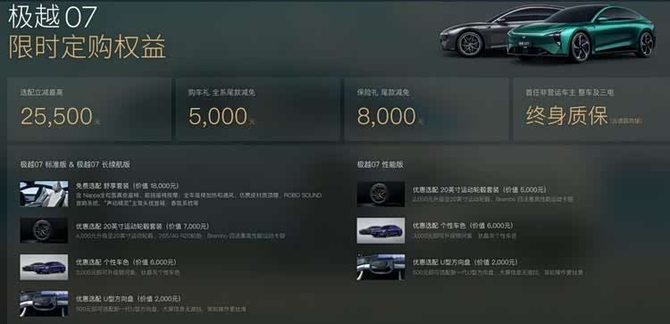 极越品牌在11月份推出了力度十足的购车政策。消费者可享受高达5000元的现金优惠,同时选装费用最高可减免2.55万元!其中,选择舒享套装(价值18,000元)搭配20英寸运动轮毂套装(价值7000元)的优惠方案尤为吸引人。这一组合不仅提升了驾驶体验,还极具性价比。