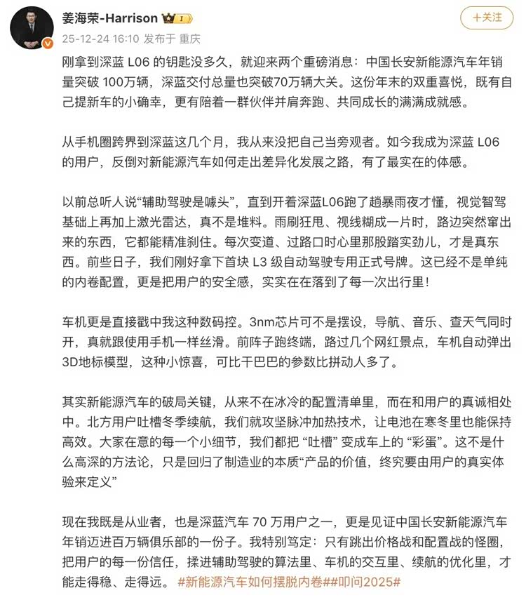 紧接着,深蓝汽车CEO姜海荣也对这一话题发表了看法。其认为,新能源汽车的破局关键,从来不在冰冷的配置清单里,而在和用户的真诚相处中。其举例,北方用户吐槽冬季续航,深蓝就攻坚脉冲加热技术,让电池在寒冬里也能保持高效。在姜海荣看来,把‘吐槽’变成车上的‘彩蛋’就是破局之法,这不是什么高深的方法论,只是回归了制造业的本质——产品的价值,终究要由用户的真实体验来定义。