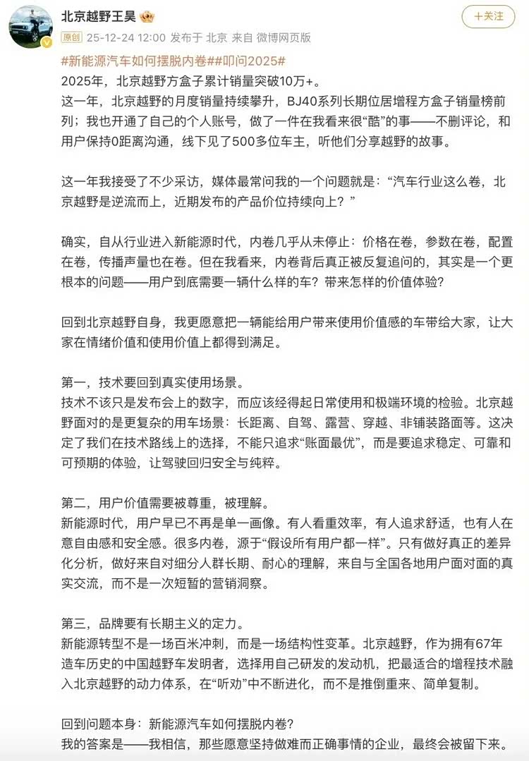 “自从行业进入新能源时代,内卷几乎从未停止:价格在卷,参数在卷,配置在卷,传播声量也在卷。”北京越野汽车董事长王昊认为,内卷背后的一个更根本的问题是——用户到底需要一辆什么样的车?带来怎样的价值体验?