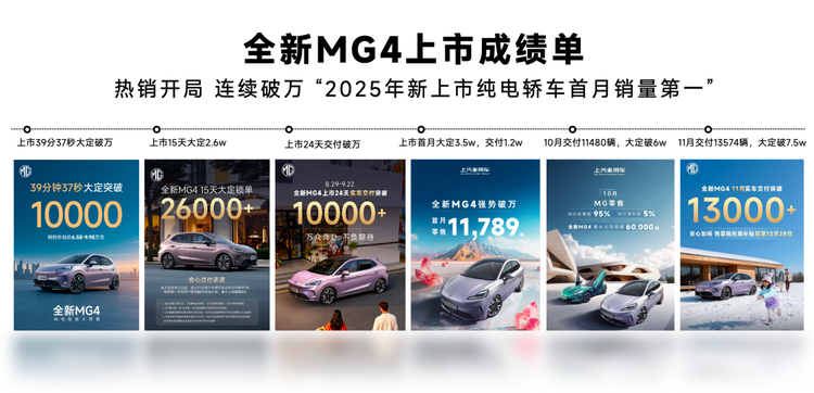 一台车扭转品牌命运,销量是最有力的证明:全新MG4上市仅39分37秒大定订单便突破万台,首月交付11,790辆,并连续4个月交付破万。截至11月底,大定订单已突破7.5万台。这一成绩,让MG品牌1-11月的国内总销量大幅超过去年全年,更关键的是,它标志着MG的销量格局实现了从“燃油主导”到“新能源主导”的决定性转变。这一次的转折,意味着MG不仅留在了牌桌上,更拿到了下一轮竞争的核心筹码。