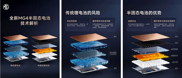 这种“技术平权”的策略,打破了行业的“天花板”,重塑了10万级电动车的价值标准。MG用行动告诉市场:平价不等于平庸,核心技术可以成为普惠大众的礼物。这不仅是产品的反差,更是一种战略眼光和品牌担当的反差。其中,半固态电池技术的应用尤为关键。 它不仅是技术的下放,更是安全理念的革新。传统锂电池在极端情况下可能存在热失控风险,而半固态电池通过创新材料与结构,大幅提升了电池安全,为用户提供了更安心的保障。