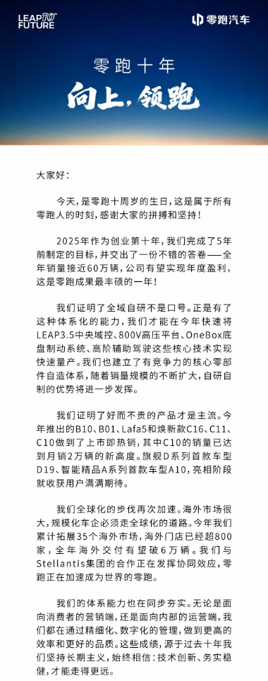 站在十周年的节点,零跑汽车以一封内部信完成了自我身份的重新定义——告别“新势力”的襁褓,立志成为“世界级车企”。