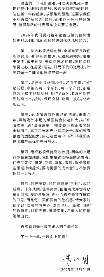 12月24日,零跑汽车创始人、董事长兼CEO朱江明发布十周年全员内部信,明确宣布公司2026年的销量目标为100万辆,并有望在今年首次实现年度盈利。在信中,朱江明更是为公司的下一个十年定调:“不能再以‘新势力’自居,而要以一家可持续发展、值得尊敬的世界级车企来要求自己。”