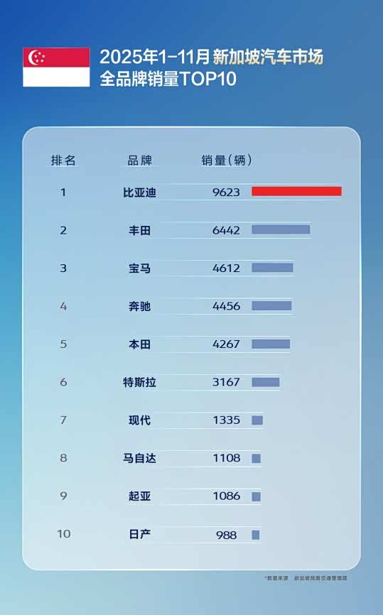 11月,比亚迪在巴西、土耳其、意大利、西班牙、匈牙利、克罗地亚等国拿下了新能源汽车销量第一,在新加坡等国家获得全品牌销冠。1-11月累计表现同样不俗,在巴西、土耳其、西班牙、意大利等国,比亚迪位列新能源汽车品牌销量榜首,获得多个国家消费者认可;在新加坡、中国香港等地区市场荣膺全品牌销量第一。