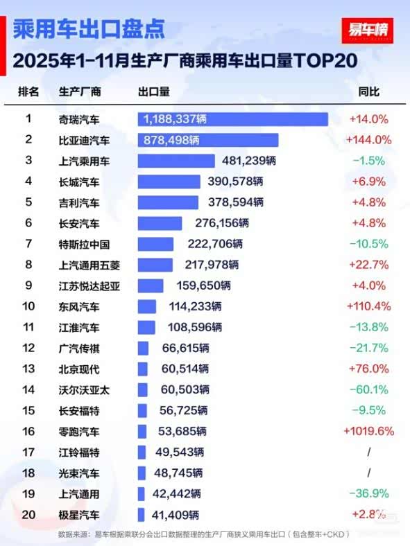 据易车数据显示,2025年11月,比亚迪乘用车出口量达到12.8万台,同比增长313.4%;今年1-11月累计出口87.8万台,同比增长144%,较2024全年总出口量已实现翻倍式增长,比亚迪成为中国出口增速最快的车企之一。