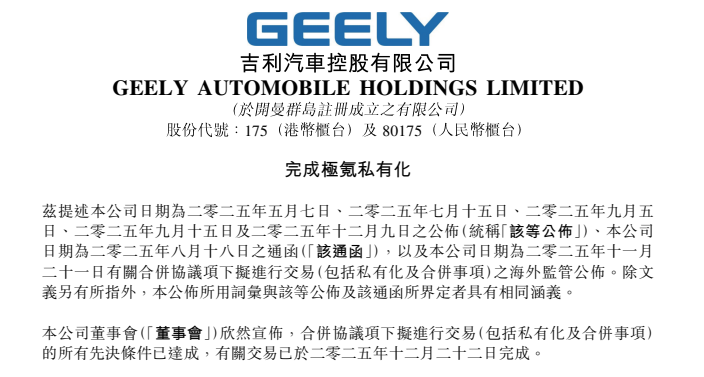 2025年12月22日,一则公告在中国汽车界引起广泛关注:吉利汽车控股有限公司正式宣布完成对极氪智能科技控股有限公司的私有化及合并事项的交易。极氪自此成为吉利汽车的全资附属公司,并自纽交所退市。