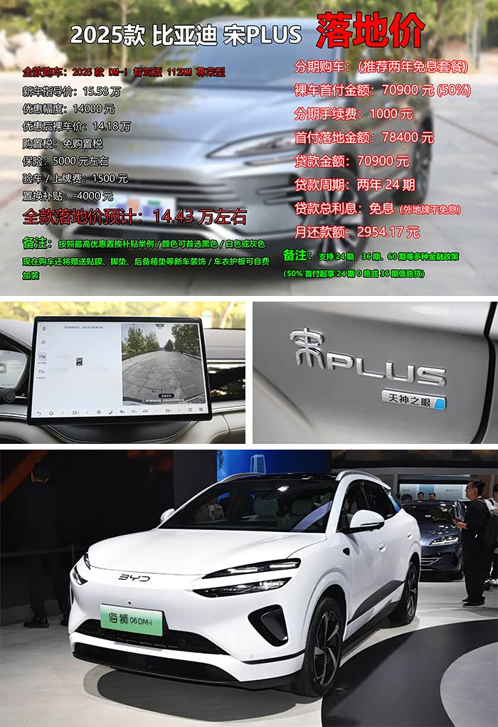 既然选好了车型,那郝哥就来为您算算落地价吧,以DM-i版本为例,推荐配置2025款DM-i智驾版112KM尊荣型官方指导价15.58万元,优惠1.4万元后裸车价为14.18万元,由于新车目前还是免购置税的,因此全款落地价只需再算上5000元保险和1500元验车上牌费就够了。如果您是置换购车还能享受4000元补贴,假如按照最高优惠幅度置换举例,那么最终全款落地价预计为14.43万左右。