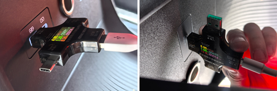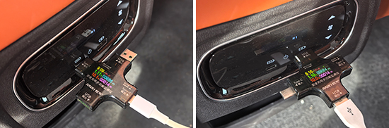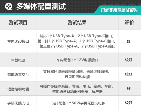 此外,我们对USB接口进行了测试。其中,前排USB Type-A接口充电功率为6.26W,电压为4.86V,电流为1.28A,USB Type-C接口充电功率为14.8W,电压为8.96V,电流为1.65A;第二排USB Type-A接口充电功率为10W,电压为9.16V,电流为1.1A,USB Type-C接口充电功率为10.1W,电压为9.09V,电流为1.11A;第三排USB Type-A接口充电功率为9.98W,电压为9.07V,电流为1.1A,USB Type-C接口充电功率为10W,电压为9.09V,电流为1.12A。