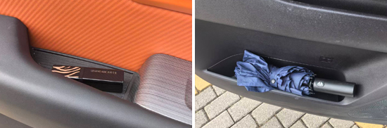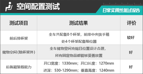 对于车内使用空间的测试,只针对前排触手可及的空间,不包括手套箱、中央扶手箱等需开启的空间。测试方法是将以下固定物品全部放置在前排的各个储物空间内,通过固定物品的放置情况来判断车辆储物空间的表现。测试选定的固定物品为:2瓶常规大小的矿泉水、1部大屏手机、1支口红、1个挎包、1副墨镜、1把折叠雨伞以及1包常规尺寸的抽纸。