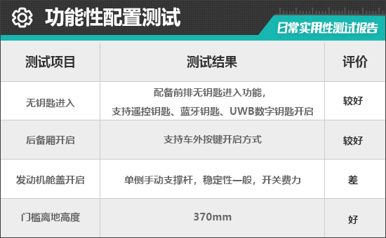 对于消费者来说,门槛离地高度一定程度上决定了上下车便利性。根据实测结果来看,评测车的门槛离地高度为370mm,驾乘人员日常上下车十分便捷。