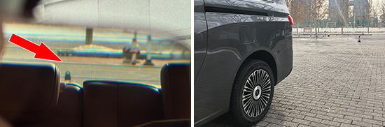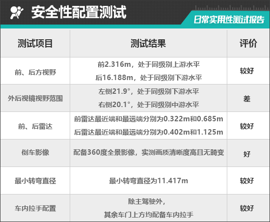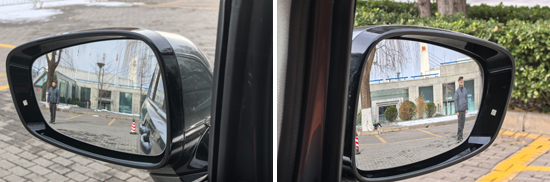 评测车左、右外后视镜均采用普通镜片。经实测,左、右外后视镜视野范围分别为21.9°和20.1°,在测试过的同级别车型中,分别处于同级别下游、中游水平。
