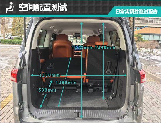 后备厢内部造型较为规整,地板平整度不错。第三排座椅支持比例放倒,放倒后可以进一步拓展后备厢空间。对于评测车后备厢的基础数值,我们也进行了实测,开口宽度为1330mm,开口长度为1270mm;后备厢进深为530-1290mm;后备厢地台与顶部的垂直高度为1240mm。