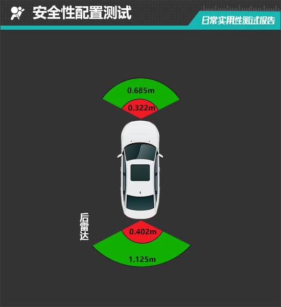 前雷达最远可以在0.685m处感应到前方物体,雷达功率表现稍显不足;最近提示距离为0.322m,接近同级别车型平均水平。