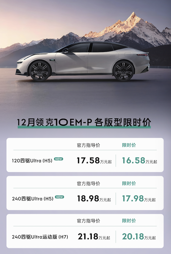 说着也怪,领克好像知道我心底“呐喊”一样。近日,领克10 EM-P推出了3款改款车型,2款千里浩瀚H5版+顶配H7版,其中,120四驱Ultra H5限时价16.58万元起,240四驱Ultra H5限时价17.98万元起。值得注意的是,新改款不是和上市款一起扩大车型矩阵,而是一种替代关系,上市款处在“停产在售”的状态。