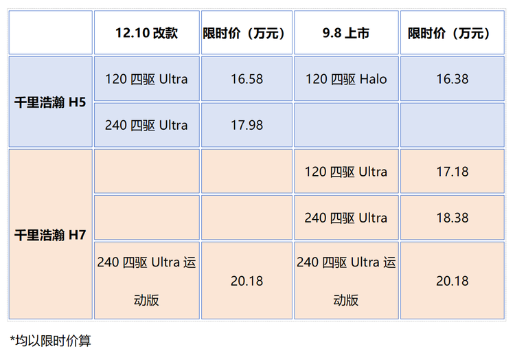 SKU从4款改到3款,全系标配的激光雷达、智电四驱都不变,新增了一个H5版本,我心心念的小电池+H7版本卖完就没有了。但如果选千里浩瀚H7,只能选顶配240四驱Ultra运动版;这次改款“精准聚焦”意味也很浓,在价格总体不变的情况下,“大电池+长续航”代替了高算力、智驾冗余的千里浩瀚H7;门槛小电池版初看高了,但2千块换来Ultra的配置,是值得的。