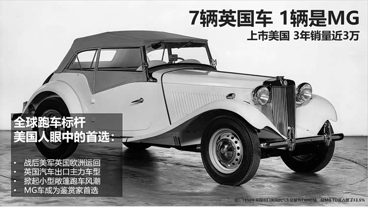 MG T迅速走红:1945-1949年的TC总产量约10010辆,80%销往美国;1949-1953年的TD总产量近3万辆,美国占比超82%,合计在美销量超3.2万辆。这3万多辆虽是“星星之火”,却填补了平价运动车空白,彻底刷新了美国人对运动车的认知。