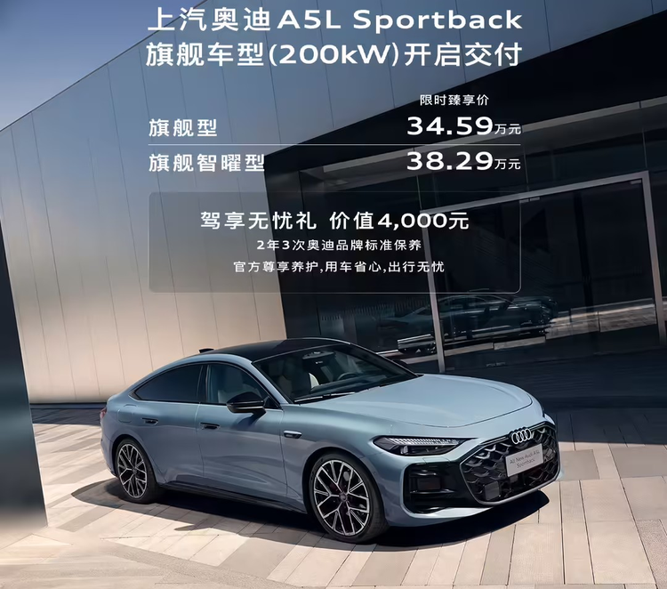 先聊聊价格。A5L Sportback旗舰版有两款配置,指导价分别是34.59万和38.29万,是整个车系里最贵的。官方还送了4000元的“无忧礼”,包含2年3次奥迪品牌保养,很实在。