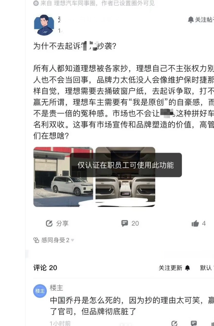 车圈又爆争议!疑似理想汽车员工在同事圈公开发飙,吐槽当下新能源市场频繁出现的 “抄袭” 现象 —— 对比保时捷等豪华品牌,不少人觉得 “理想被抄活该”,这让他直呼 “很操蛋”。该员工还直言,即便打官司赢不了,理想也该主动维权,为车主树立 “我是原创” 的自豪感,而非让大家有 “花更多钱却像冤种” 的感受,同时也不能让 “拼好车” 的抄袭者名利双收。这番言论引发热议,而 “理想为何不起诉抄袭车企” 的疑问,也再次被推到台前。