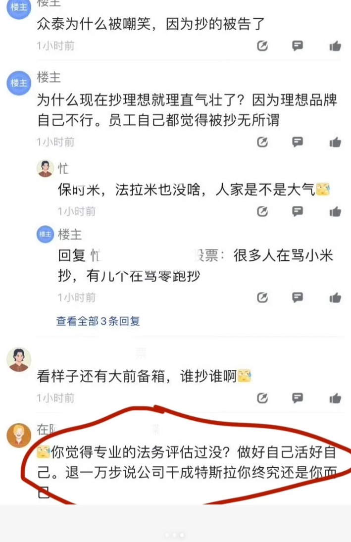 不过也有理智声音出现,有同事反问 “你觉得专业的法务评估过没?”,认为公司应 “做好自己、活好自己”,即便未来发展成特斯拉规模,个体的处境也不会有本质改变,暗指维权需理性,不能仅凭情绪冲动。还有人抛出 “优等生被差生抄作业会在乎吗?” 的观点,认为真正的强者无需纠结抄袭;也有网友调侃 “看样子还有大前备箱,谁抄谁啊”,暗示部分设计可能存在行业共性,难以界定抄袭。