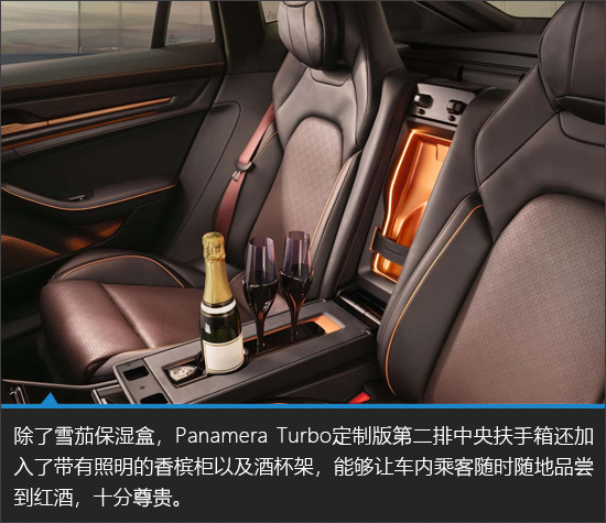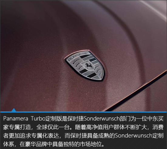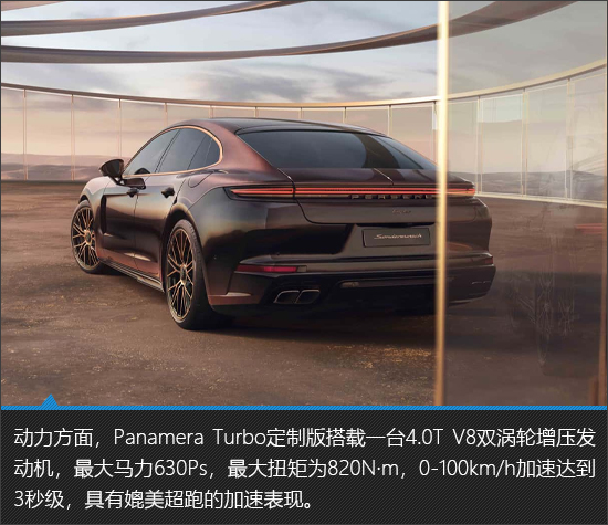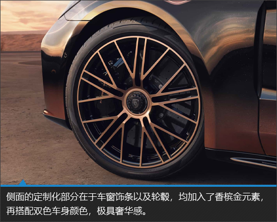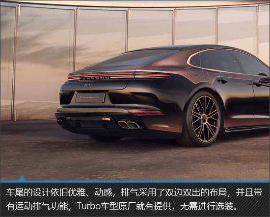 Panamera Turbo定制版在外观层面充分展现了保时捷的个性化设计实力。专属调制的车身颜色、细腻处理的香槟金装饰件以及可按需求选配的多样轮毂,皆让这台定制版车型拥有更鲜明的专属气场。