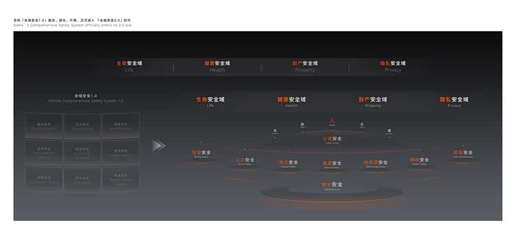 结合智能时代的安全新需求和新挑战,吉利“全域安全2.0”技术体系秉持“以人为尊”理念,通过技术升级、能力突破与范式创新,将侧重“整车安全”的视角升级为“人-车-路-云-星”的生态视角,旨在贯穿用户出行全场景、覆盖出行全领域、联动出行全生态;并以“生命零伤亡、健康零危害、财产零损失、隐私零泄露”四大安全愿景为指引,逐步构建的一套为消费者提供全面的安全保障技术体系。