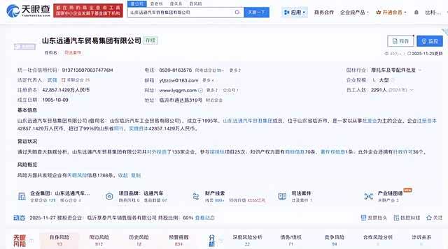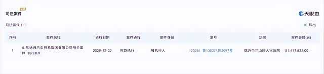 车家号·0浏览·2025-12-25 14:27 · 山东天眼查信息显示,近期山东远通汽车贸易集团有限公司恢复被执行人信息,执行标的为5141.832万元,执行法院为临沂市兰山区人民法院,案件相关细节尚未完全公示。